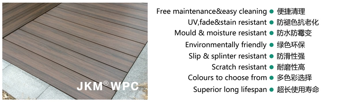 捷科木共挤塑木地板依托优秀的技术,采用轻量化的结构设计,结合优选材料,经久耐用。 型材表面拥有防滑槽型、质朴树纹等多样化的造型设计,使之满足更多客户的不同需求。 捷科木不含甲醛,不含重金属等有害物质,不翘曲变形,不开裂,超低的、甚至零维护成本。 强力内核,配合坚实的聚合表层,令其使用寿命超25年。